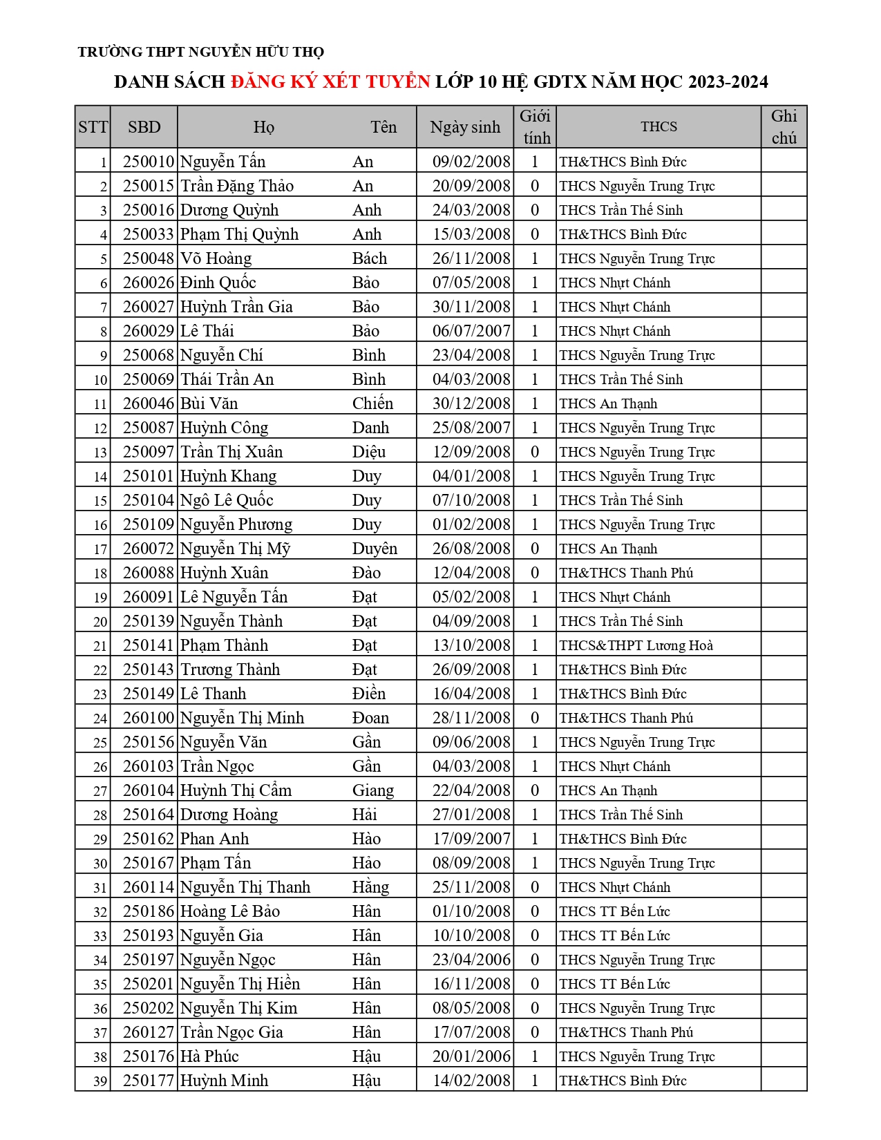 Danh sách đăng ký xét tuyển lớp 10 hệ GDTX năm học 2023-2024