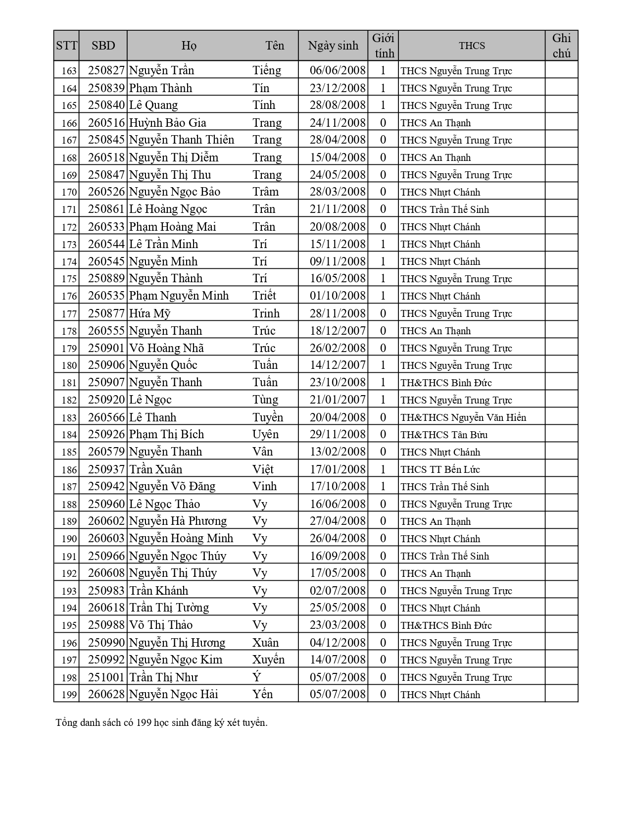 Quý phụ huynh, học sinh kiểm tra danh sách đăng ký xét tuyển lớp 10 hệ GDTX được theo thứ tự theo tên học sinh (đính kèm) nếu có thiếu sót đơn vui lòng báo lại văn phòng trường trong ngày 10/7/2023 để bổ sung danh sách xét tuyển.